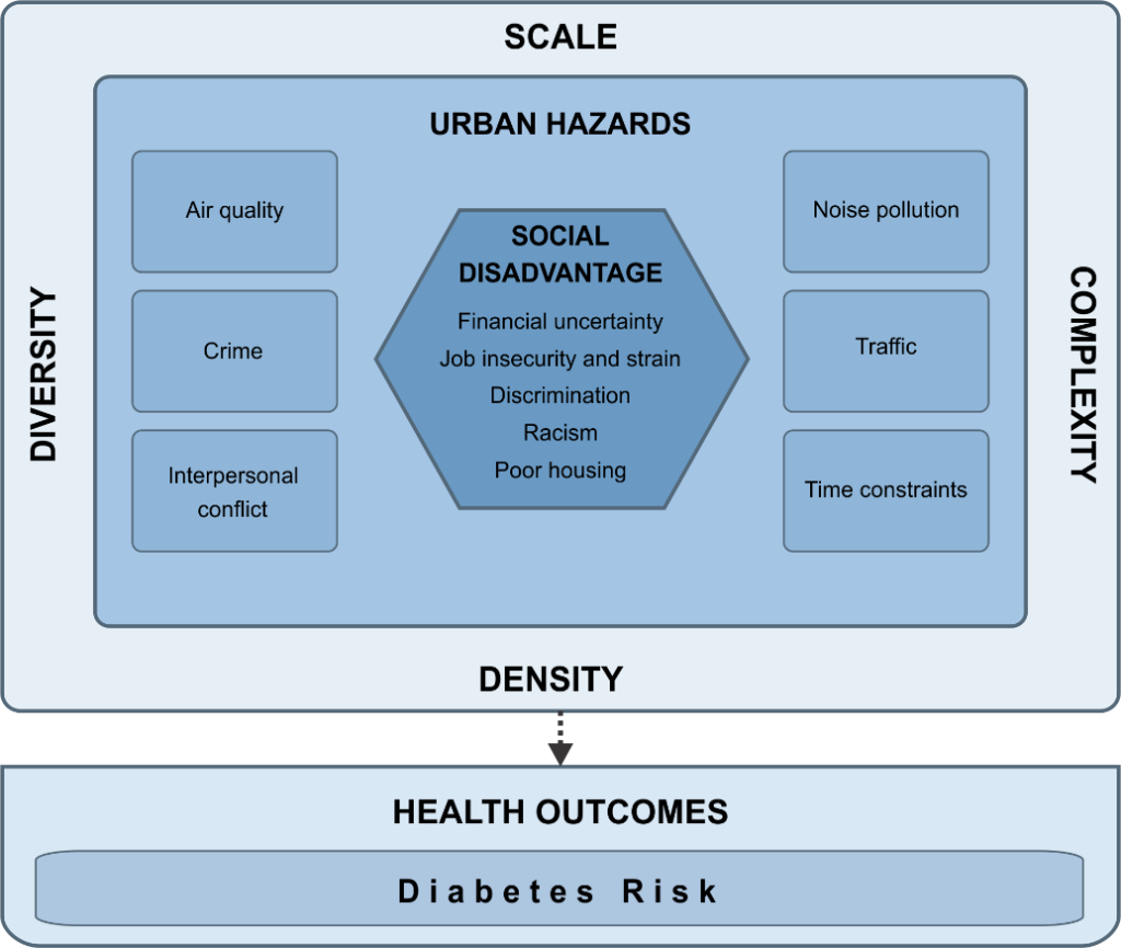 We present a novel conceptual framework called the Urban Stress Model, which intentionally crosses disciplinary boundaries. We suggest that the unique physical form of cities contributes to an increased stress burden through the interacting influences of daily urban hazards and social disadvantage. We use New York City as a case example because of its high diabetes rates and its legacy of unequal healthcare in the context of concentrated wealth. Therefore, New York City can provide valuable insights for newly developing urban centers worldwide confronting similar challenges and growing social and health inequality.