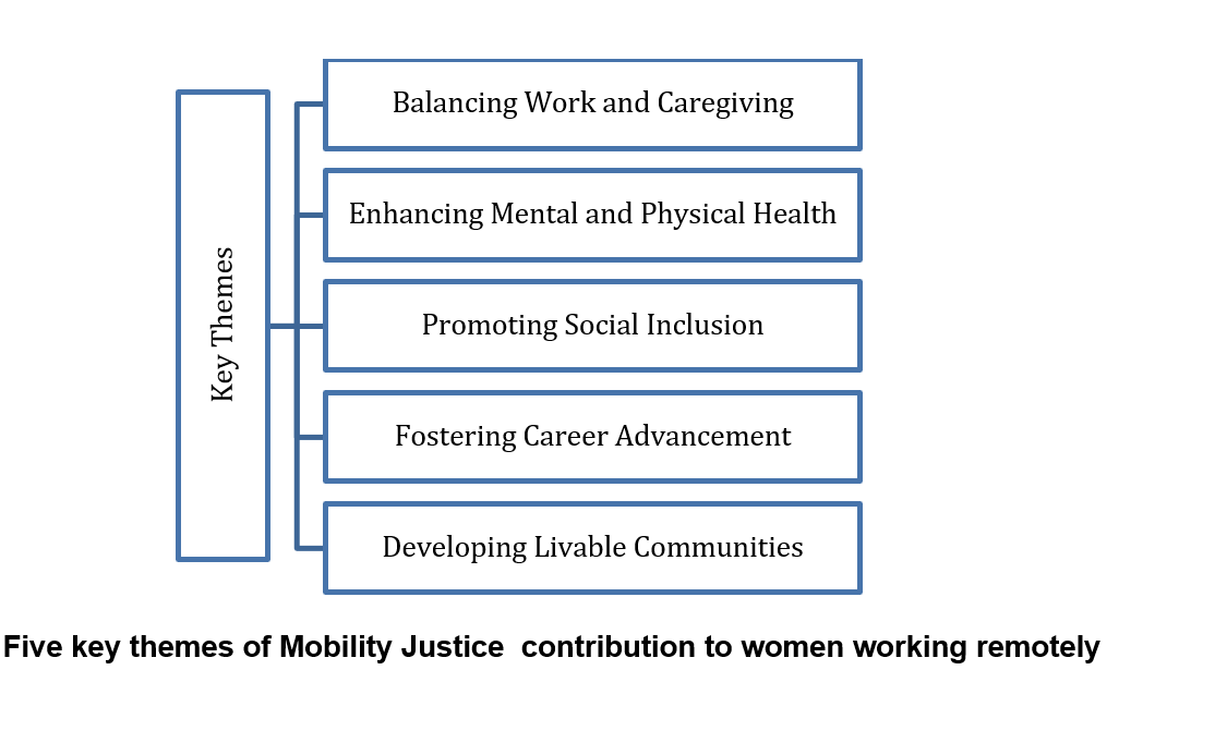 1. Concluding five key themes that reflect the mobility justice role in fulfilling remote working women’s needs, particularly those balancing caregiving responsibilities and career advancement.