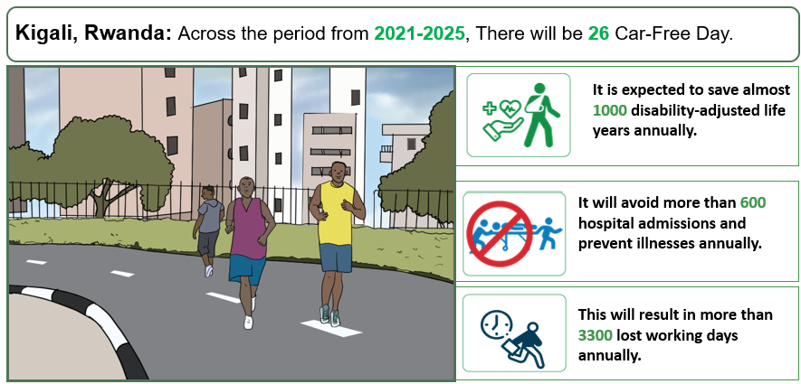 The health impact of non-motorized transport events in Kigali, known as ‘Car-Free Days,’ goes beyond just mass physical exercise. Importantly, it has reduced air pollution by 15%, this is expected to save more than 200 disability-adjusted life years annually.